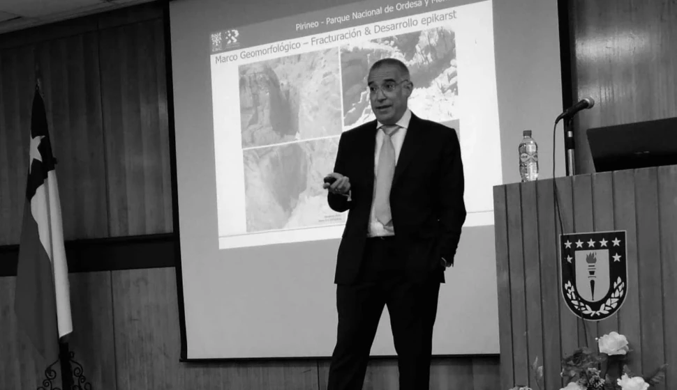 Jódar es doctor en Hidrología por la Universidad Tecnológica de Cataluña y visitó a la Universidad de Concepción por una invitación del Centro Fondap Crhiam, que financió su participación en el “Segundo Congreso Chileno y Primer Congreso Internacional Siembra y Cosecha de Agua: Un Sistema Ancestral de Gestión del Agua”, que se realizó en Iquique entre el 11 y el 13 de mayo y fue patrocinado por ese centro. El experto español ha trabajado en numerosos proyectos de investigación en ámbitos como la gestión de aguas subterráneas y la evaluación del impacto del cambio climático en los recursos hídricos. En su charla, destacó que en los sistemas hidrológicos de alta montaña se genera el recurso hídrico del que depende directamente el 20% de la población mundial, y planteó que conocer estos sistemas es clave para poder gestionar el agua. El Dr. Jódar describió el trabajo de investigación que está desarrollando junto a su equipo en los Pirineos, al Norte de España, específicamente en el Parque Nacional de Ordesa y Monte Perdido, con una predominancia de material carbonatado en su geología, como la roca caliza, lo que incide en el comportamiento hidrológico, ya que los carbonatos son sensibles a la disolución por efecto del agua de lluvia. Además, este suelo tiene numerosas fracturas por donde se infiltran las aguas. Según las investigaciones realizadas por su equipo, en la zona de estudio “la capacidad de infiltración es superior al 50% de la precipitación, lo que es una barbaridad, pues en otros acuíferos desarrollados en otras litologías la capacidad de infiltración no llega al 20%, y el resto del agua se va por escorrentía directa o por evaporación”, apuntó. A más de dos mil metros sobre el nivel del mar, en zonas de difícil acceso y crudos inviernos con abundante nieve, el equipo cuenta con estaciones meteorológicas que van midiendo todas las variables climáticas que tienen incidencia en la hidrología, tanto las usuales, como precipitación, temperatura y evaporación, como las hidroquímicas y el contenido isotópico de las aguas de lluvia y también de la nieve. “Y no solo eso, van controlando cómo varía la densidad de la nieve con el tiempo, para que podamos determinar cuánta agua hay en un centímetro de nieve”, aseguró el investigador, quien acotó que la temperatura y las lluvias son determinantes en la densidad. “No es trivial saber cuánta agua corresponde según la altura de la nieve, no es nada fácil”, manifestó. El investigador destacó igualmente la importancia de medir el contenido isotópico del agua, pues permite conocer aspectos clave, por ejemplo, el tiempo que tarda el agua en infiltrarse y en salir a la superficie nuevamente a través de un manantial. “También controlamos cómo varían una serie de variables hidrológicas que están relacionadas con el funcionamiento de nuestro sistema, además de la precipitación y la temperatura del aire, por ejemplo, en los manantiales medimos la conductividad eléctrica del agua, la temperatura del agua y los caudales de descarga de los manantiales”, detalló. El Dr. Jódar comentó, además, que parte del trabajo de investigación son las exploraciones espeleológicas, con buceo incluido, para caracterizar estas estructuras y “tener una idea clara de qué es lo que le pasa al agua cuando entra en el sistema y como se mueve dentro”.